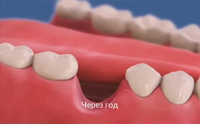 Через год изменения уже будут видны невооруженным глазом. Выдвинутый зуб будет мешать при протезировании противоположного. Придется подпиливать выдвинувшийся зуб или возвращать его на место с помощью ортоимплантов.